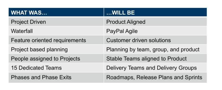 A few examples from PayPal of this shared language are given below. The table shows what the language used to be (what was) and what it became (will be) after the transformation. This is taken from the whitepaper published on the PayPal website detailing their transformation: